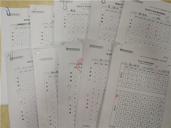 舉辦安全生產(chǎn)知識測試答題活動。在“安全生產(chǎn)月”活動中,各項目紛紛組織開展“消除事故隱患、筑牢安全防線”安全生產(chǎn)知識測試,營造了“人人學(xué)安全,人人懂安全”的良好氛圍,切實有效提升了項目一線職工的安全意識,強化了安全技能,為公司健康平穩(wěn)發(fā)展筑牢“安全墻”。